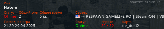 Играет на Counter Strike 1.6 сервере. Страна: СШАПервый раз замечен 21:27 29.04.2025