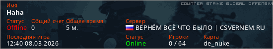 Играет на Counter Strike Global Offensive сервере. Страна: РоссияПервый раз замечен 12:38 08.03.2026
