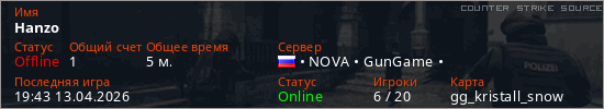 Играет на Counter Strike Source сервере. Страна: РоссияПервый раз замечен 19:41 13.04.2026