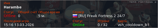 Играет на Team Fortress 2 сервере. Страна: РоссияПервый раз замечен 15:12 13.03.2026