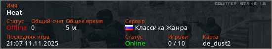 Играет на Counter Strike 1.6 сервере. Страна: РоссияПервый раз замечен 21:01 11.11.2025