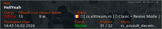 Играет на Counter Strike 1.6 сервере. Страна: РумынияПервый раз замечен 18:48 15.02.2026
