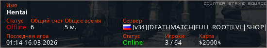 Играет на Counter Strike Source сервере. Страна: РоссияПервый раз замечен 00:59 16.03.2026