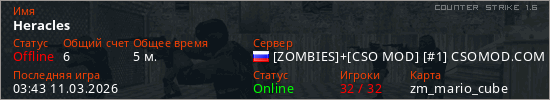 Играет на Counter Strike 1.6 сервере. Страна: РоссияПервый раз замечен 03:41 11.03.2026