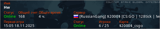 Играет на Counter Strike Global Offensive сервере. Страна: РоссияПервый раз замечен 15:05 18.11.2025