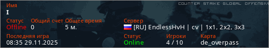 Играет на Counter Strike Global Offensive сервере. Страна: РоссияПервый раз замечен 08:10 29.11.2025
