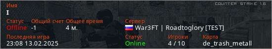 Играет на Counter Strike 1.6 сервере. Страна: РоссияПервый раз замечен 23:02 13.02.2025