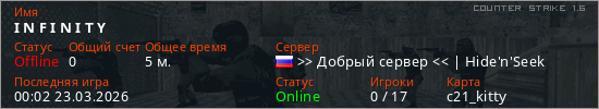Играет на Counter Strike 1.6 сервере. Страна: РоссияПервый раз замечен 23:24 22.03.2026