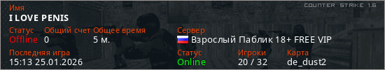 Играет на Counter Strike 1.6 сервере. Страна: РоссияПервый раз замечен 15:11 25.01.2026