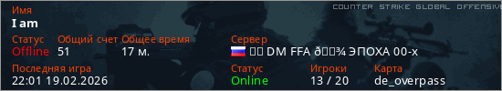 Играет на Counter Strike Global Offensive сервере. Страна: РоссияПервый раз замечен 16:57 19.02.2026