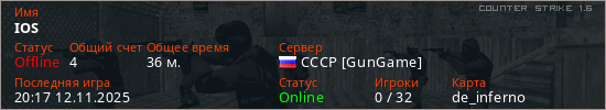 Играет на Counter Strike 1.6 сервере. Страна: РоссияПервый раз замечен 19:23 12.11.2025