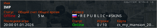Играет на Counter Strike 1.6 сервере. Страна: РоссияПервый раз замечен 19:54 01.01.2026