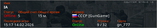 Играет на Counter Strike 1.6 сервере. Страна: РоссияПервый раз замечен 08:51 07.02.2026