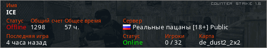 Играет на Counter Strike 1.6 сервере. Страна: РоссияПервый раз замечен 19:58 04.04.2025
