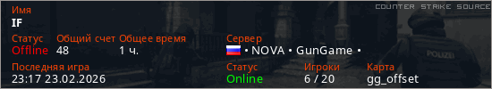 Играет на Counter Strike Source сервере. Страна: РоссияПервый раз замечен 21:50 02.02.2026