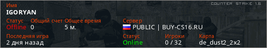 Играет на Counter Strike 1.6 сервере. Страна: РоссияПервый раз замечен 16:09 23.03.2026