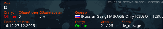 Играет на Counter Strike Global Offensive сервере. Страна: РоссияПервый раз замечен 15:54 27.12.2025