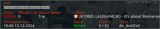 Играет на Counter Strike 1.6 сервере. Страна: РумынияПервый раз замечен 19:34 15.12.2024