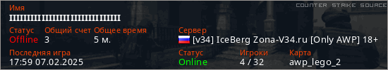 Играет на Counter Strike Source сервере. Страна: РоссияПервый раз замечен 17:34 07.02.2025