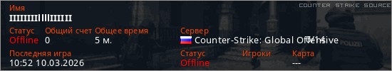 Играет на Counter Strike Source сервере. Страна: РоссияПервый раз замечен 10:35 10.03.2026