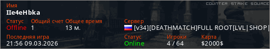 Играет на Counter Strike Source сервере. Страна: РоссияПервый раз замечен 02:57 09.03.2026