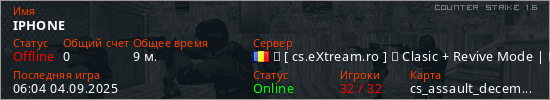 Играет на Counter Strike 1.6 сервере. Страна: РумынияПервый раз замечен 06:07 08.08.2025