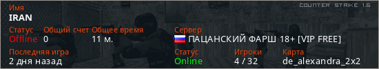 Играет на Counter Strike 1.6 сервере. Страна: РоссияПервый раз замечен 11:21 15.03.2026
