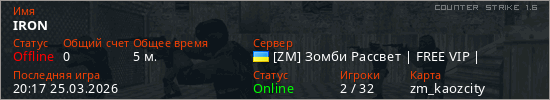 Играет на Counter Strike 1.6 сервере. Страна: УкраинаПервый раз замечен 20:08 25.03.2026