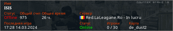 Играет на Counter Strike 1.6 сервере. Страна: РумынияПервый раз замечен 17:52 10.06.2023