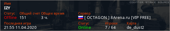 Играет на Counter Strike Source сервере. Страна: РоссияПервый раз замечен 02:44 11.04.2020