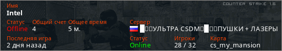 Играет на Counter Strike 1.6 сервере. Страна: РоссияПервый раз замечен 19:46 13.04.2026