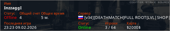 Играет на Counter Strike Source сервере. Страна: РоссияПервый раз замечен 23:21 09.02.2026