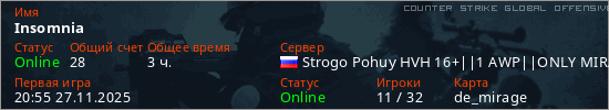 Играет на Counter Strike Global Offensive сервере. Страна: РоссияПервый раз замечен 20:55 27.11.2025