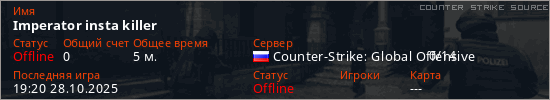 Играет на Counter Strike Source сервере. Страна: РоссияПервый раз замечен 19:01 28.10.2025