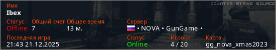 Играет на Counter Strike Source сервере. Страна: РоссияПервый раз замечен 23:13 18.12.2025