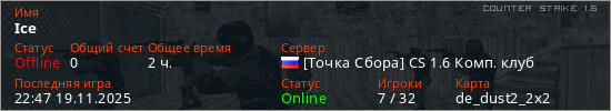 Играет на Counter Strike 1.6 сервере. Страна: РоссияПервый раз замечен 20:39 02.10.2025