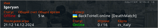 Играет на Counter Strike 1.6 сервере. Страна: УкраинаПервый раз замечен 21:10 14.12.2024
