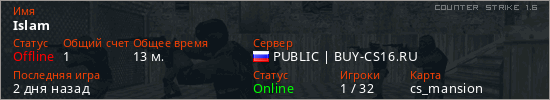 Играет на Counter Strike 1.6 сервере. Страна: РоссияПервый раз замечен 17:00 21.03.2026