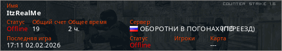 Играет на Counter Strike 1.6 сервере. Страна: РоссияПервый раз замечен 20:59 29.01.2026