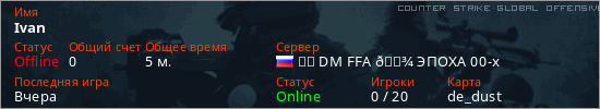 Играет на Counter Strike Global Offensive сервере. Страна: РоссияПервый раз замечен 18:45 27.02.2026