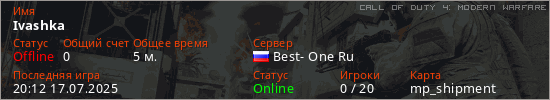 Играет на Call of Duty 4: Modern Warfare сервере. Страна: РоссияПервый раз замечен 19:49 17.07.2025