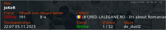 Играет на Counter Strike 1.6 сервере. Страна: РумынияПервый раз замечен 15:03 10.05.2022