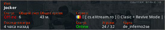 Играет на Counter Strike 1.6 сервере. Страна: РумынияПервый раз замечен 16:26 19.02.2026