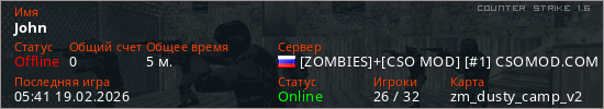 Играет на Counter Strike 1.6 сервере. Страна: РоссияПервый раз замечен 05:36 19.02.2026
