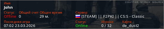 Играет на Counter Strike Source сервере. Страна: РоссияПервый раз замечен 14:48 13.03.2026