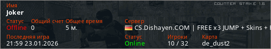 Играет на Counter Strike 1.6 сервере. Страна: ГерманияПервый раз замечен 21:57 23.01.2026