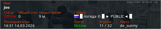 Играет на Counter Strike 1.6 сервере. Страна: РоссияПервый раз замечен 11:36 14.03.2026