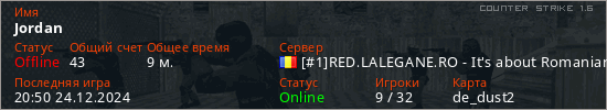 Играет на Counter Strike 1.6 сервере. Страна: РумынияПервый раз замечен 15:37 20.12.2024