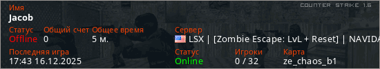 Играет на Counter Strike 1.6 сервере. Страна: СШАПервый раз замечен 17:38 16.12.2025