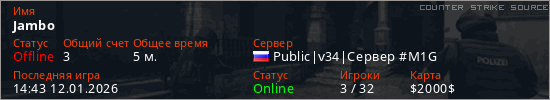 Играет на Counter Strike Source сервере. Страна: РоссияПервый раз замечен 14:39 12.01.2026